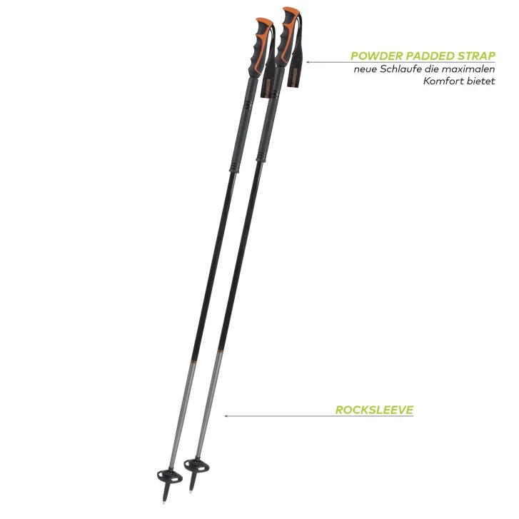 Unsere neue Descent Serie vereint das sportliche Griffgefühl aus dem Rennlauf mit der Funktionalität eines Tourenstockes. Der Descent Carbon Rocksleeve ist außerdem durch das Rocksleeve Unterteil bestens vor Schlägen geschützt und besteht leichtem Carbon. Anhand des beweglichen Eisflankensystems passt sich der Teller bis zu 28° an die Hangneigung an.
